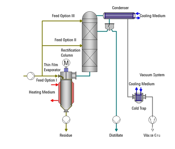 熱敏性產(chǎn)品輕相和重相沸點接近的很難通過單級系統(tǒng)進行分離,結(jié)合精餾塔以及作為再沸器的薄膜蒸發(fā)器可以提升此類產(chǎn)品的分離效果。精餾塔內(nèi)更多的理論塔板數(shù)可得到更好的產(chǎn)品收率和純度。再沸器中較短的停留時間以及較低操作壓力可以避免產(chǎn)品中有效成分的熱分解。香精香料的提純,特種營養(yǎng)品,歐米伽3脂肪酸,熱穩(wěn)定性差的精細化學品或藥品,都是此工藝方案的經(jīng)典應用實例。